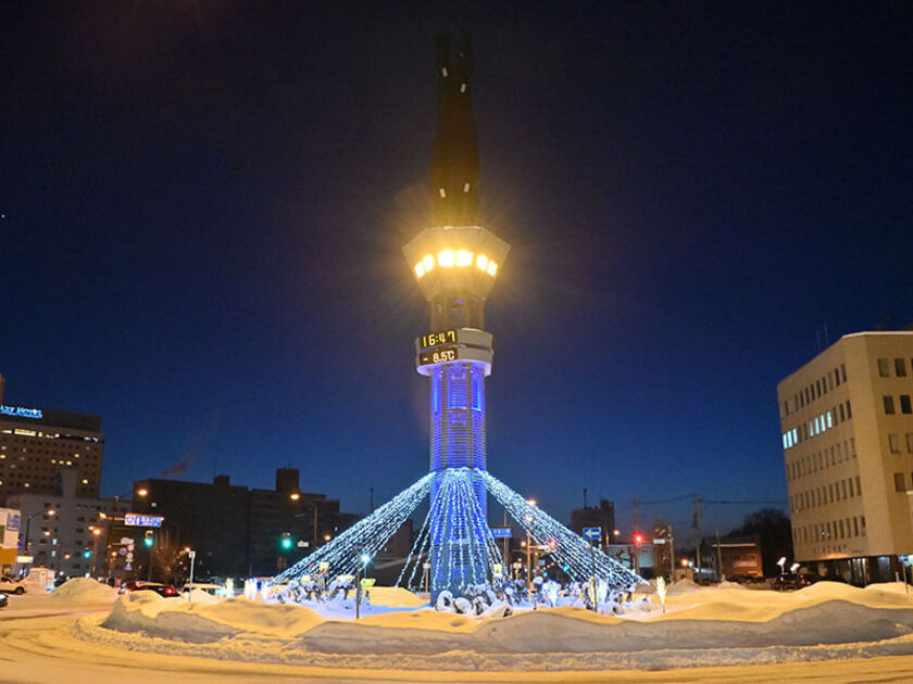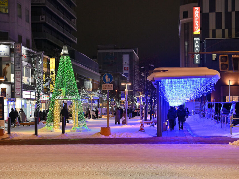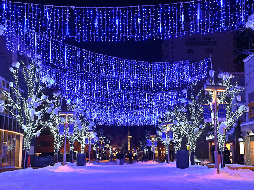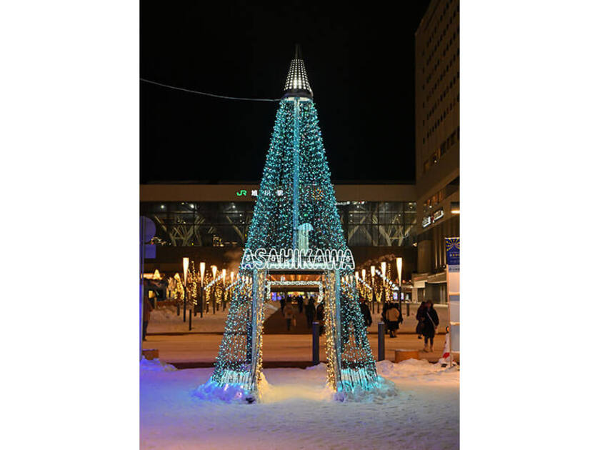 イルミネーションが旭川に灯ってから30周年を機に「あさひかわ街あかりイルミネーション」として親しまれてきた名称が装い新たに、「ユキノワアサヒカワ〜雪と光がつなぐ街〜」と変わりイルミネーションもグレードアップ!この素敵な名称は応募いただいた300件を超える中から選ばれました。JR旭川駅前のランドマークとなるモニュメントイルミネーションを入口に、動物たちに歓迎されながら買物公園へ、光が降り注ぐアイスフォール、7条緑道の光のトンネル、開拓のイメージの塔、さらに常盤ロータリーまでアーティスティックなイルミが通りを彩ります。真白な雪に映えて輝くイルミネーションは、旭川だからこそ見える美しい景色です。