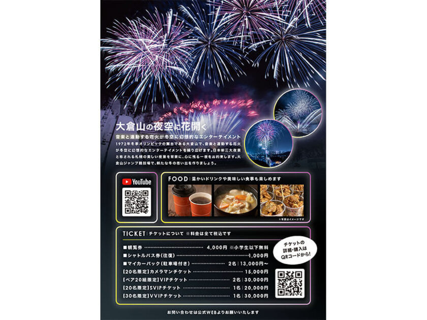 『芸術花火シリーズ』を各地で手掛け、優秀な花火師が集結するグレートスカイアートの最先端の花火が今年も大倉山にやってきます!音楽のリズムやボーカルに合わせた1/30秒単位の緻密なプログラム。目の前で繰り広げられる花火の連打は感動ものです。一般チケットの他、特別ラウンジでドリンクをいただきながら花火を見ることができるVIP、さらにコースディナーがつくVVIPチケットも。また新発売となるSVIPチケットは、札幌オリンピックミュージアム名誉館長であり、自身もスキー競技の国際大会で優勝した経験を持つ阿部さんによるジャンプ台解説付きです!ぜひ心躍るひと時を、大倉山で過ごしませんか。