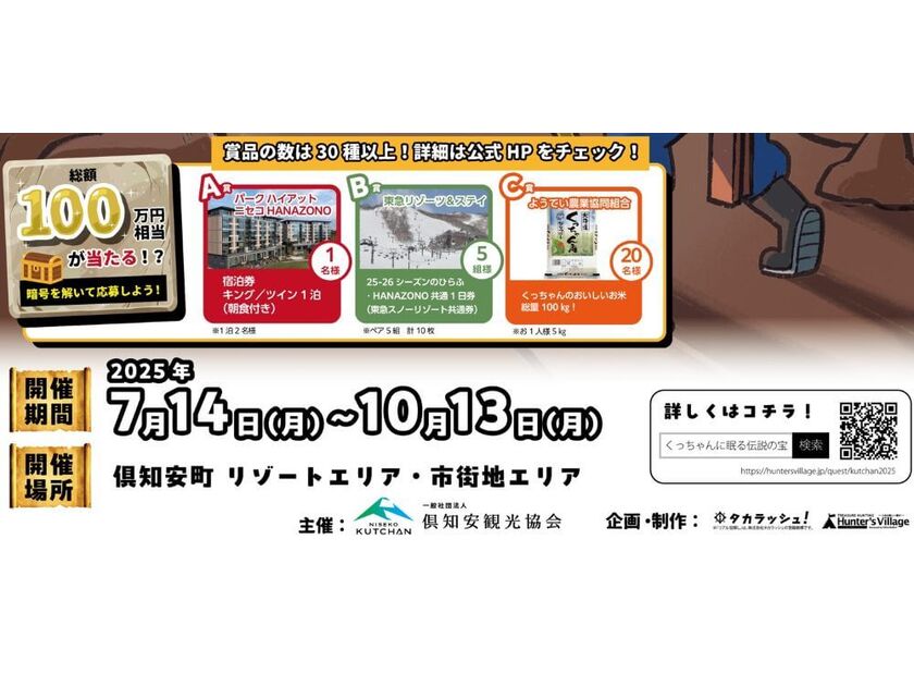 北海道ニセコ・倶知安町が、この夏、巨大な“謎解きフィールド”に変わる!主催は倶知安観光協会、企画は“本気の宝探し”で話題の「タカラッシュ」。ヒントは倶知安町の町中に隠され、舞台はリゾートエリアから市街地まで。参加費はなんと無料!宝を見つけた方の中から抽選で、総額100万円相当の豪華賞品が当たります。