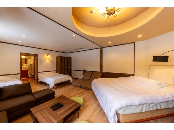 キングサイズベッド1台とセミダブルベッド2台のお部屋です。