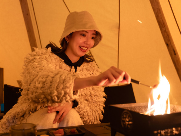 室内温度約20℃の焚火専用テントで、ご自身で薪を燃やし、バウムクーヘンなどのフードをあぶりながらアルコールなどのドリンクを楽しむ。