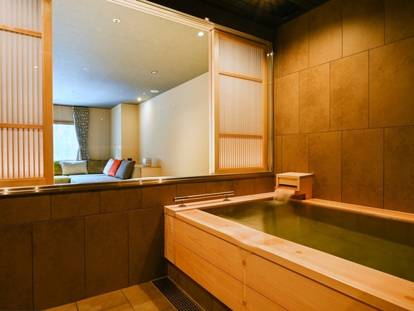 全室掛け流しの温泉とフロア限定の専用ラウンジが、滞在を優雅に彩ります。