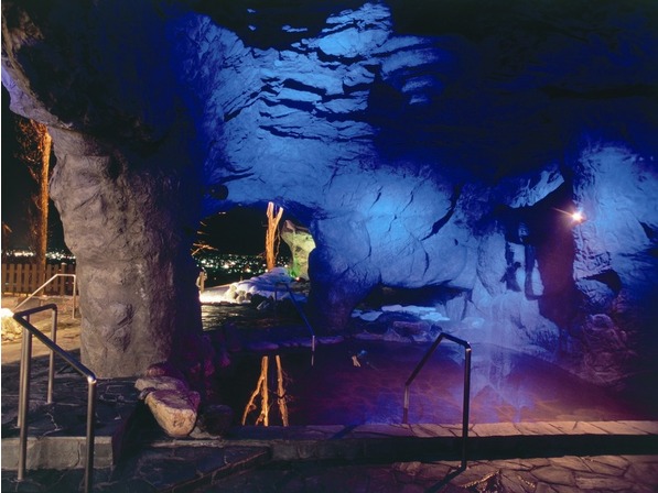 夜には青くライトアップされた洞窟風呂が幻想的な雰囲気…。