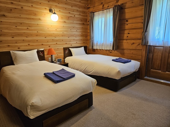 • カナダ産ホワイトパインで造られた重厚なログハウス、木の香り漂う落ち着いたツインルームです。