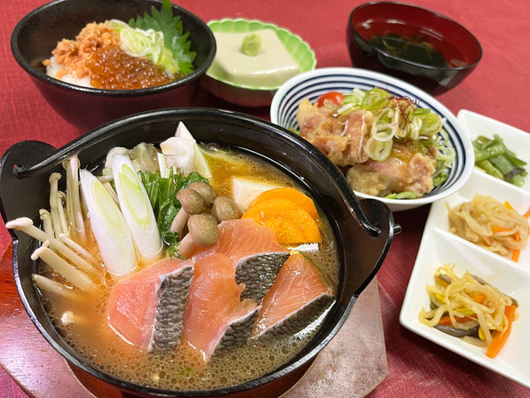(石狩鍋、副菜3種、ザンギ、鮭のはらこ飯、お吸い物)