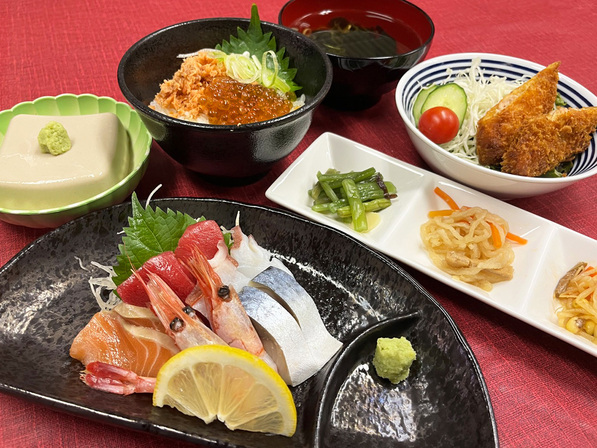 (刺身5種盛り、副菜3種、鮭フライ、鮭のはらこ飯、お吸い物)