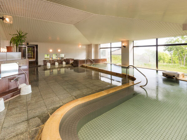 ○内風呂 --- 大きな湯船が2つ、ガラス張りで明るく開放的な浴場です。