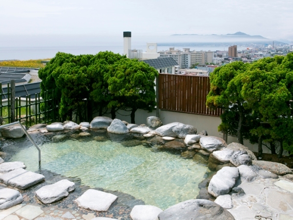 空中露天風呂「いさりび」では、街並みと海岸美が織りなす美景を一望。