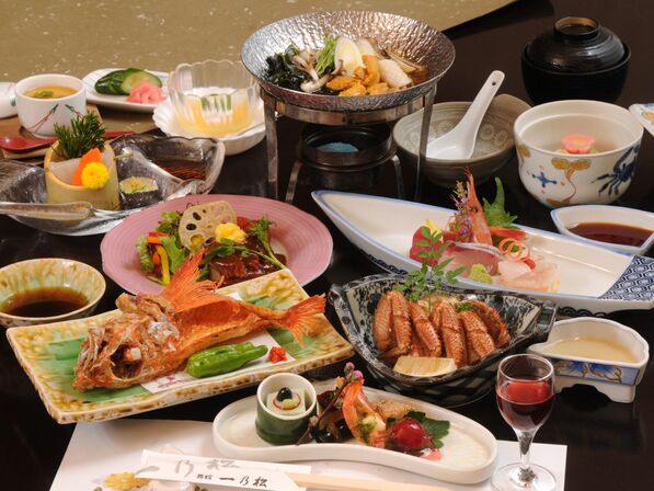 身はふっくらジューシー、皮はサクサク、骨まで食べられちゃう一乃松名物「生きんきの唐揚げ」や、「道産牛フィレステーキ」の付いた豪華会席膳をご用意。
