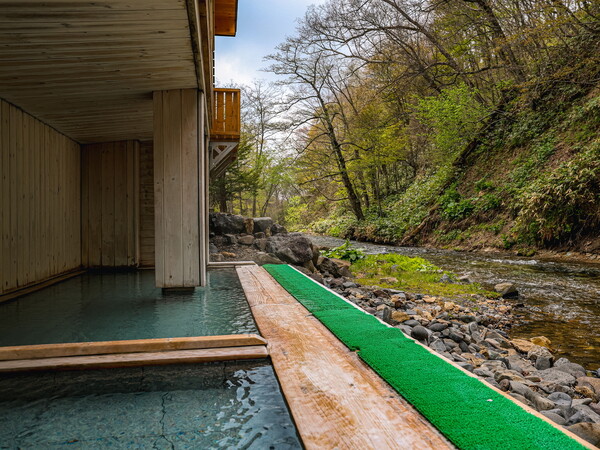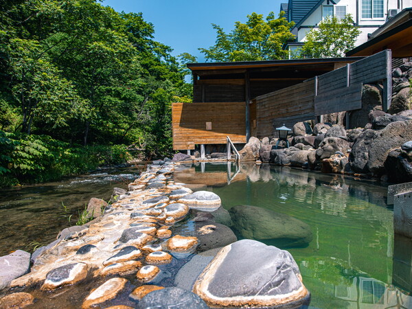 露天風呂。渓流のせせらぎや、野鳥のさえずりを聴きながらお楽しみください。