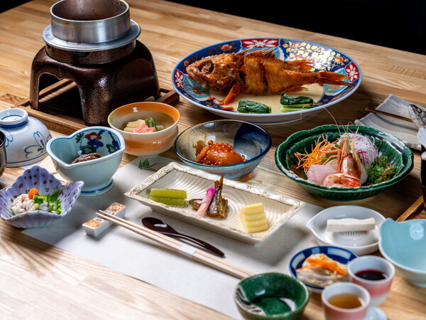 夕食「せせらぎ御膳」一例。中標津の地の物を活かした本格日本料理です。※季節や仕入れ状況により変更となる場合がございます。