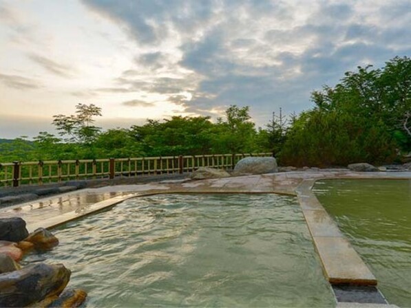 • 源泉かけ流し露天風呂。塩化物を含む温泉でお肌がツルツルに♪入浴後の保温効果も期待できます。
