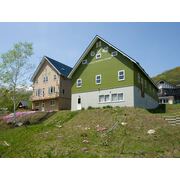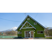 西にアンヌプリ・東に羊蹄山を眺める絶好のロケーションに位置する緑の建物のバックパッカー。