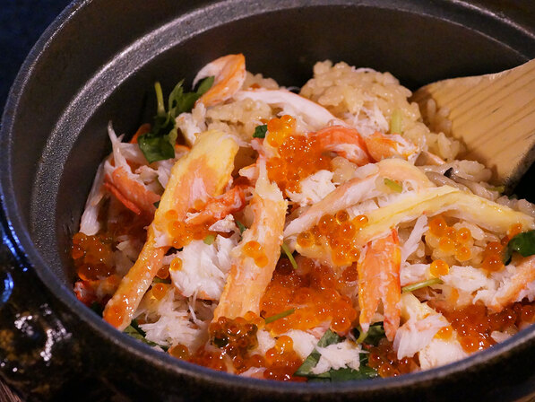 夕食の会席コースの白米を北海道産の蟹いくらご飯にアップグレードいたします。
