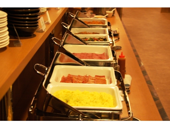 定番の卵料理やハム・ベーコン・ソーセージ、パン、サラダ、ジュース各種。