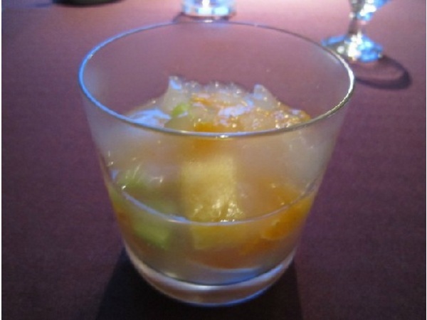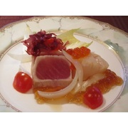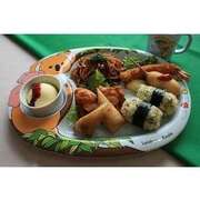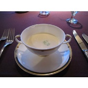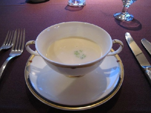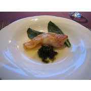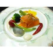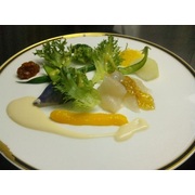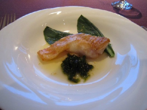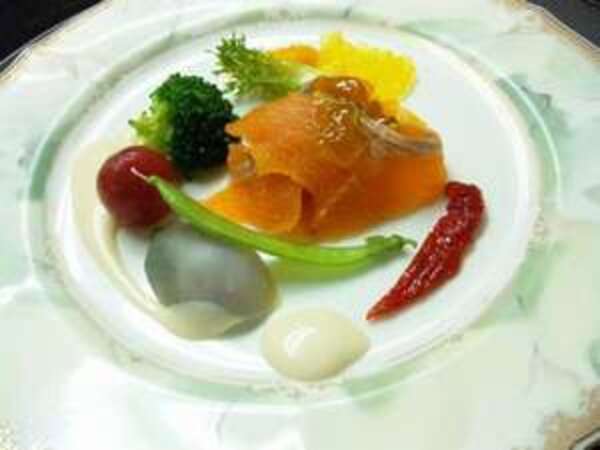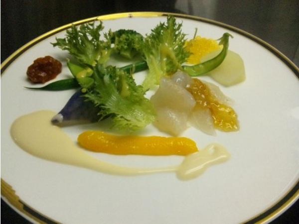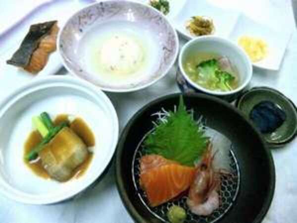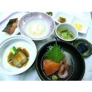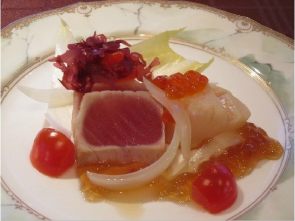 夕食 魚料理一例:赤魚の青のり添え、春野菜のスープとともに