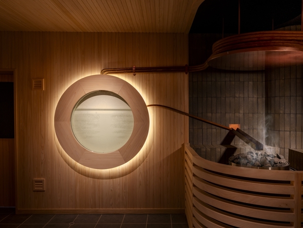 • 【山側サウナ】オートロウリュを完備。銅管を伝い流れた水が光の水槽に溜まり、部屋を包む熱へと変わります