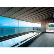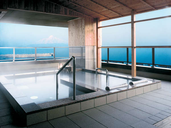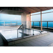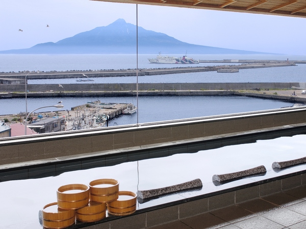 【花海の湯】日本海に浮かぶ利尻富士が一望できる浴場。水平線を境に輝く海と空を眺めながら湯ったり。