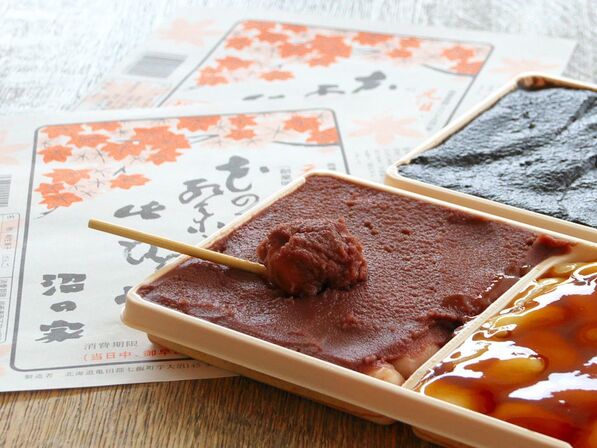 一般的な串だんごとは異なり、折に詰めたあんの中に小さなだんごが入っている大沼の名物です。