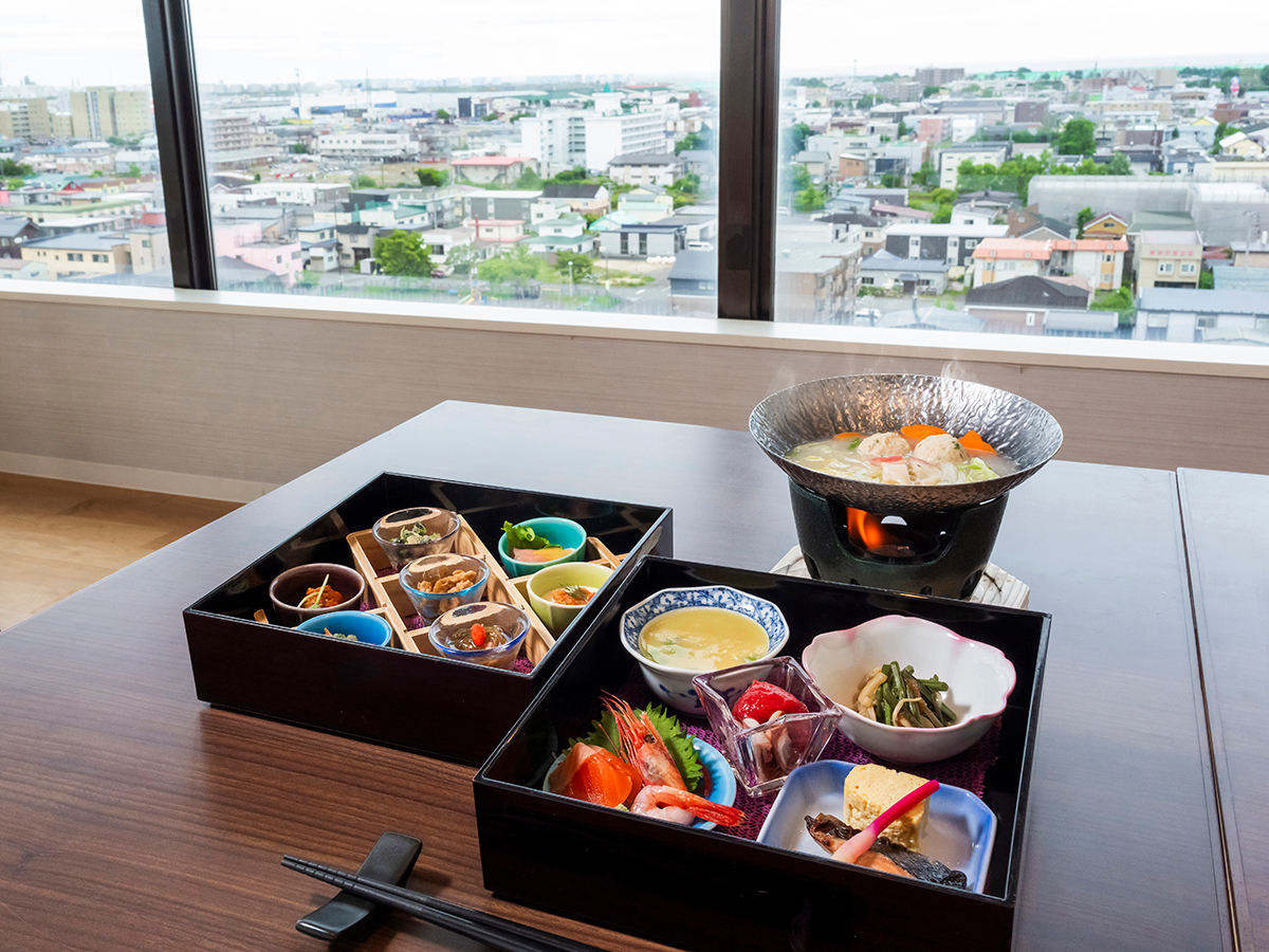 朝食は苫小牧を見渡せる11階展望レストランでハーフバイキングスタイル!望楼NOGUCHI登別、緑の風リゾートきたゆざわ、乃の風リゾート、各館の料理長監修のこだわり「朝の御膳」をご用意。