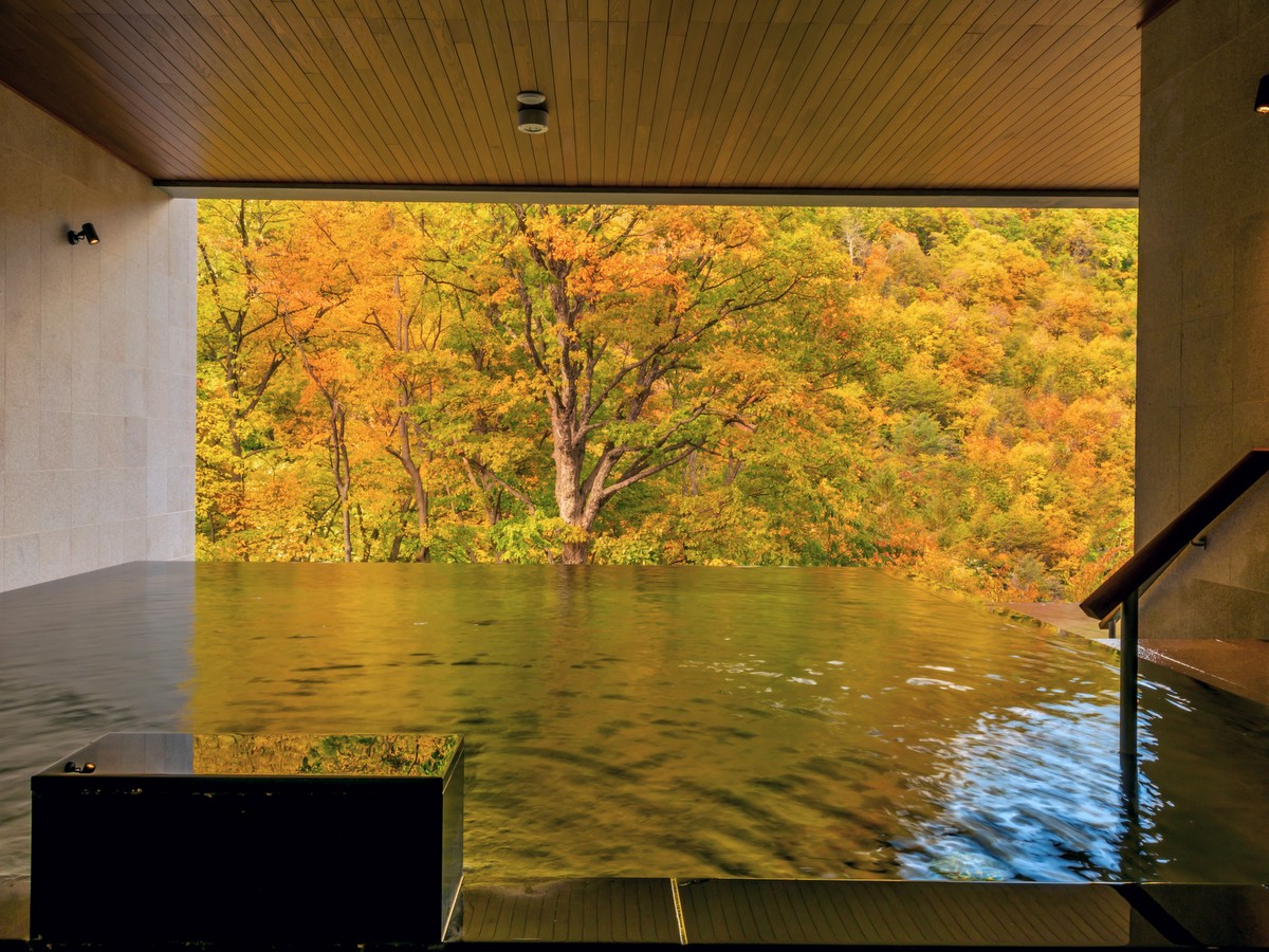 一面に広がる大きな窓から景観を望む内湯と、渓流からの澄んだ空気に抱かれる露天風呂。