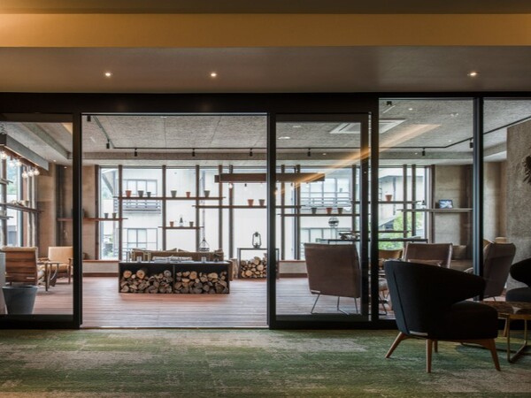 1Fリビングカフェ_広々とした窓からは川湯の温泉川を眺めることができます。