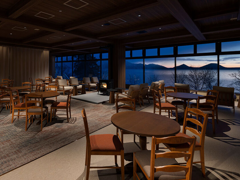• リニューアルしたロビーレストラン。窓から見えるのは夕景の支笏湖