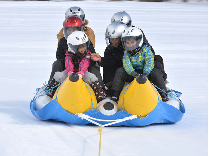 • 自力運転のスノーモービルと違い、どこに行くかわからない氷上バナナボートはスリル満点!