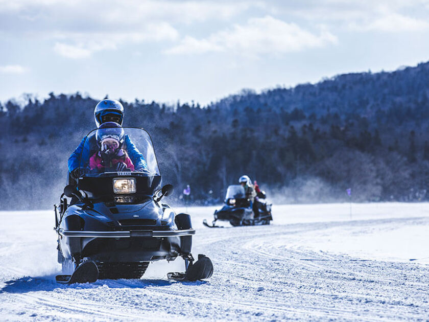 • 氷結した阿寒湖を走り抜けるスノーモービル。乗車前にインストラクターが指導してくれるので安心です