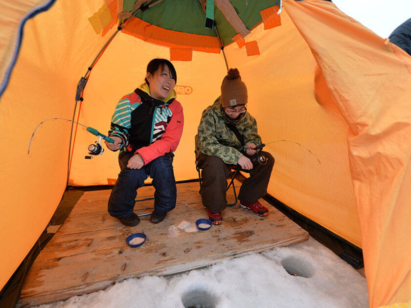 • 阿寒湖名物のワカサギ釣りは氷上テント内で釣るので寒さを防げます
