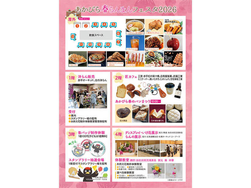 赤平市の楽しい春のお祭りがJR赤平駅直結の赤平市交流センターみらいにて開催されます。館内1階エントランスでは洋ランの販売、2階では赤平市をはじめ周辺地域の人気パン屋さんが出店。らんの展示、スタンプラリーや缶バッジ製作体験などもあります。会場前広場ではキッチンカーが集結しグルメも楽しめますよ!