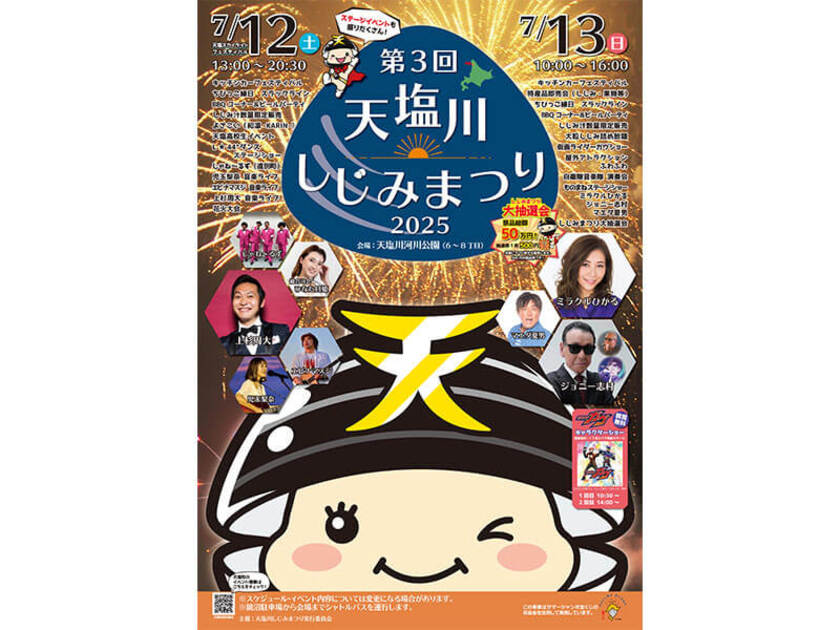 特産のしじみ貝にちなんだ天塩町最大の観光イベント「天塩川しじみまつり」が第3回目を迎えます!しじみ汁数量限定販売や、前日祭の音楽ライブや花火大会、本祭では大粒しじみ詰め放題や景品総額50万円の大抽選会のほか「仮面ライダーガヴ」のキャラクターショー、ミラクルひかるさんらのものまねステージショーもあります。お楽しみに!