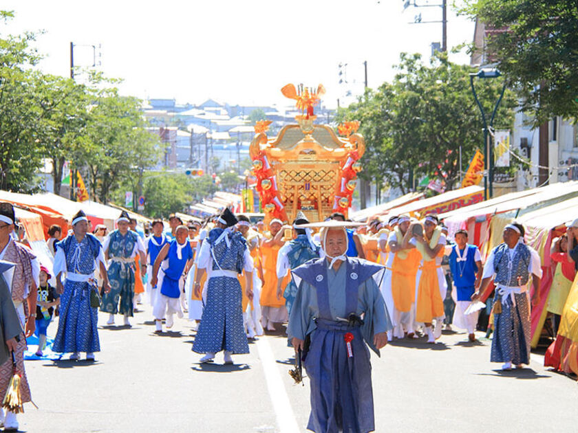 • 8月第2金曜日に宵宮祭、第2土曜日に本祭及び神輿渡御(往路)、翌日に神輿渡御(復路)が行われます。見どころとなる露店街及び夜のイベント会場は、市内中心部の緑町になります。神社から緑町までは徒歩で20分程度かかりますので、ご了承下さい。