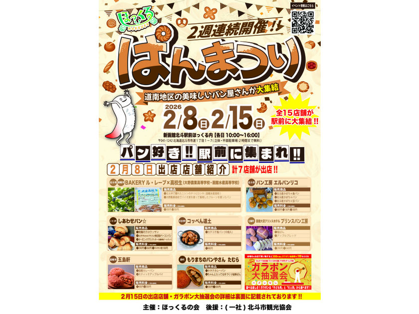 楽しい企画で毎年好評を博している「ほっくるパンまつり」が今年も開催します!北斗市をはじめ、森町や七飯町などの店舗から美味しいパンが大集合。今年は2週連続で開催しますので、お出かけ前にホームページを要チェック!
