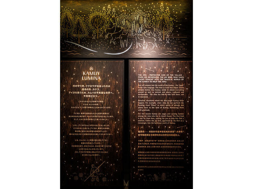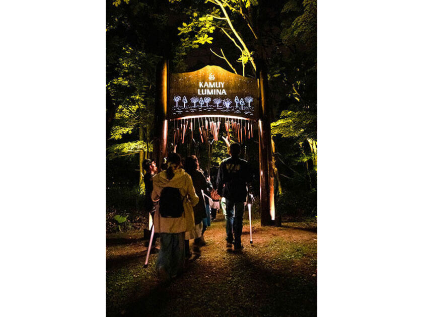 2019年オープンの「阿寒湖の森ナイトウォーク KAMUY LUMINA(カムイルミナ)」。ルミナ・ナイトウォークは、世界で活躍するカナダのモーメントファクトリー社が制作した世界で10作目の作品で、国立公園内での開催は世界初!美しいプロジェクションが阿寒湖の森の各所に施され、実際に森を歩きながら「カムイ(アイヌの神)」の国を目指す冒険ストーリーを体感。かわいらしいカケス(小鳥)が案内役となり、1人1本渡されるアイヌの杖をモチーフにした「リズムスティック」を手に進みます。約50分間で阿寒湖畔の地形や景観を活かしたデジタルアートやアクティビティを体験しながら、アイヌ文化と自然との関わりについて楽しく学ぶことができる内容です。想像以上の幻想的な世界に驚くはず!
