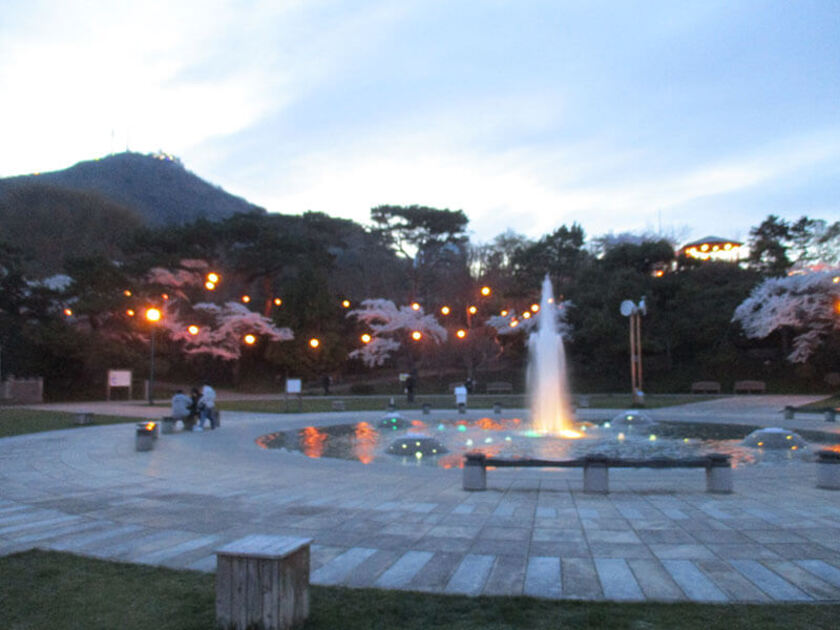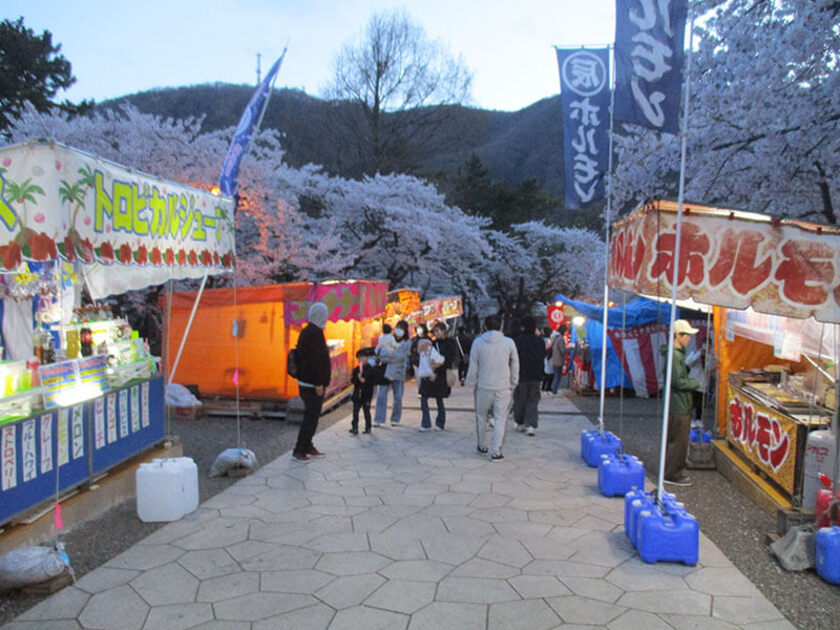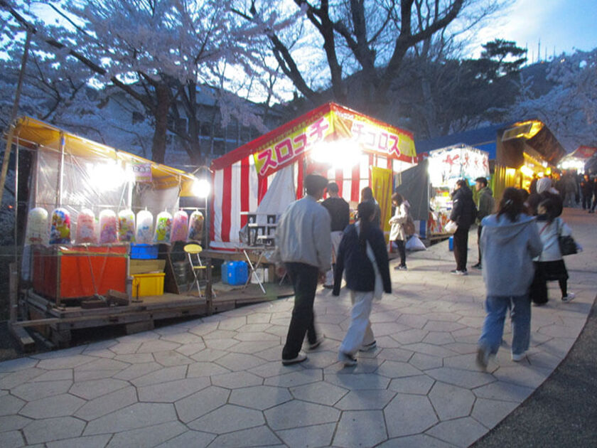 函館山のふもとに位置する函館公園は、五稜郭公園と並ぶ函館の二大花見スポット。園内にはソメイヨシノを中心に約360本の桜の木が植えられています。例年、開花時期にあわせて夜間の花見電飾が行われ、美しく幻想的な夜桜を楽しむことができます。2025年の開花日は4月23日(平年は4月28日)、満開日は4月28日(平年は5月2日)でした。満開から1週間は見ごろの桜が楽しめます。花見電飾の期間は、公園内に露店も登場します。