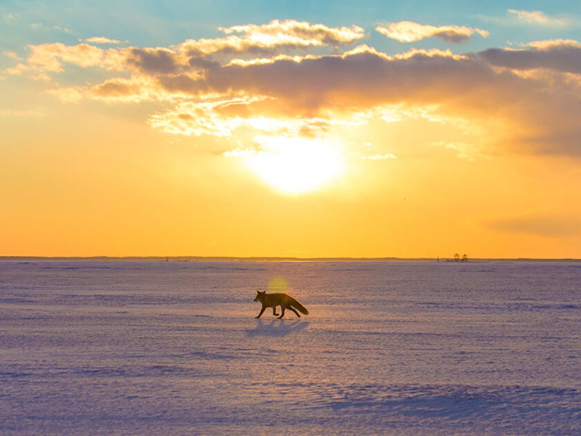 野付半島の内海が結氷する1月下旬からは、海の上を歩くことが出来る『氷平線ウォーク』を体験することが出来ます。水平線ならぬ「氷平線」とは文字通り、水平線のように広がる氷の大地のことであり、凍てついた海と空の境をなす線です。北海道の東の果て、野付半島になぜ氷の大地ができあがるのか、そのなりたちと魅力をご紹介します。半島の内側の野付湾は「海」ですが、厳冬期になると一面凍ってしまいます(1月~3月中旬頃)。広い海が凍り、平らで広大な白い平原が現れるのです。また砂嘴である野付半島には山がなく、空の広さも格別!この組み合わせが、白と青の世界を生み出します。360度さえぎる物がない景色は、まるで日本のウユニ塩湖のよう。そこで撮影する、トリック写真は映えスポットとしても注目を浴びており、様々な媒体で特集されました。撮影はアイデア次第。自由な発想で新しいトリック写真を生み出してみませんか?