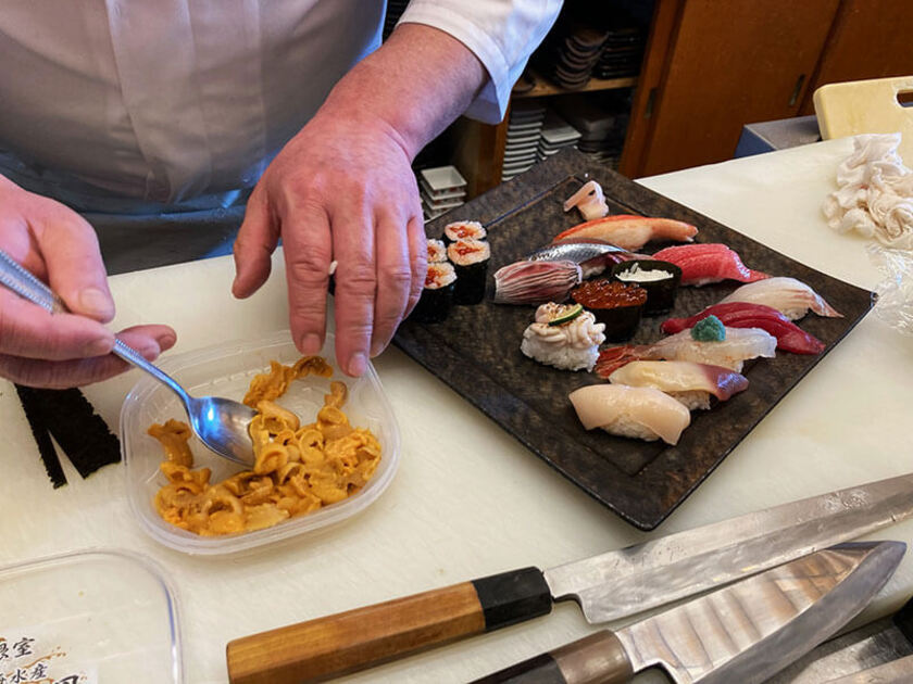 歌舞伎の三大名作のひとつ「義経千本桜」に由来する「すしの日」は、1961年(昭和36年)に制定された歴史ある記念日です。毎年、全国各地で様々なキャンペーンが実施されています。北海道では、11月1日の「すしの日」に組合加盟店で飲食・出前・持ち帰りを利用して専用はがき(または専用メールフォーム)で応募すると、抽選で42名様に「お楽しみ海産物(送料込み10,000円相当)」などの賞品が当たります。鮨組合青年部が持ち回りで担当するポスターでは、長谷川憲さん(大門福寿し/函館市)が、地元道南の郷土色を織り込んだ鮨・料理を作りました。