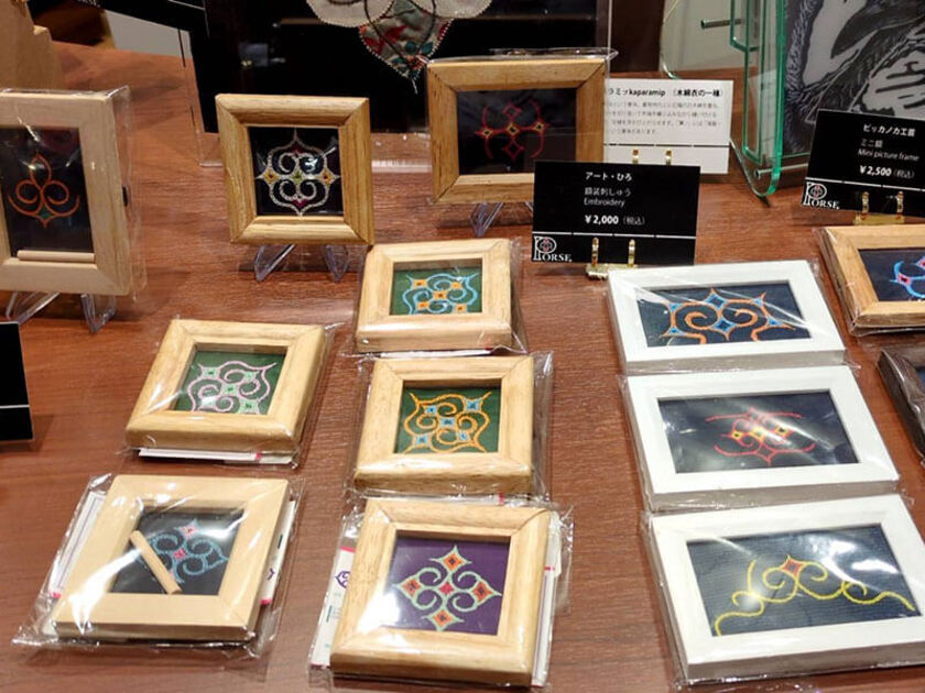 アイヌ工芸品などを展示販売している「PORSE(ポㇿセ)」には、刺しゅう、木彫、アイヌ文様入り雑貨など約400点の商品が並びます。アイヌ文化に詳しい店舗スタッフにお気軽にお声がけください!店舗隣のスペースでは、工芸品を手にとって触れることができるほか、伝統衣装の試着体験もお楽しみいただけます。また、毎月第1・第3日曜日にはワークショップなどのイベントも開催しています(詳しくはHPまたはInstagramから)。