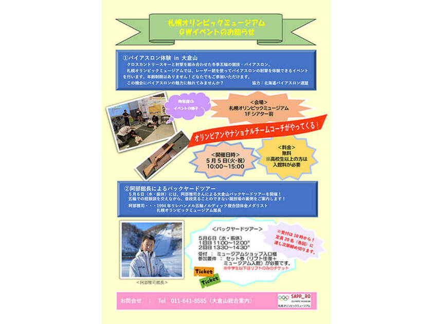 札幌オリンピックミュージアムでは、ゴールデンウイーク特別企画として「バイアスロン体験 in 大倉山(5日)」と「阿部館長によるバックヤードツアー(6日)」を開催します。北海道バイアスロン連盟協力のもと、専用シミュレーターを使ったバイアスロンの射撃体験を行います。なんとオリンピアン・日本代表コーチがインストラクターとなって撃ち方を教えてくれます!子どもが楽しめるよう射撃のコツを分かりやすくレクチャーしてくれるのでご安心を。バックヤードツアーは、リレハンメルオリンピックノルディック複合団体金メダリストの阿部館長が、普段は入ることのできない大倉山ジャンプ競技場の裏側を案内してくれます。冬季オリンピック競技の面白さを感じることができる貴重な体験をぜひご家族で♪