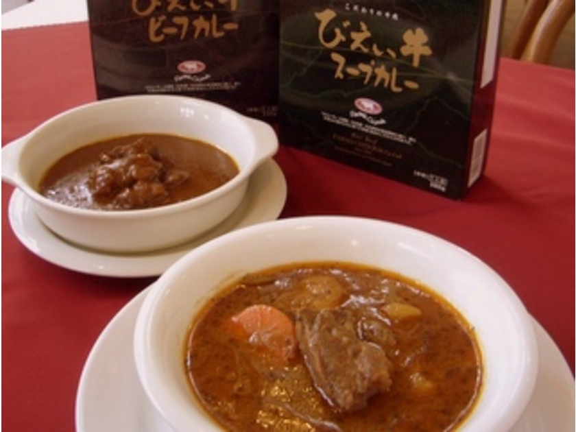 おいしいお肉はこだわりの餌から。日本酒の酒粕の生酵母や低農薬米の稲藁、さらに、大雪山の湧き水を餌にしながら、丘の上でのびのびと育てている、「ファームズ千代田」のオリジナルブランド・びえい和牛は、脂と赤身の甘さが特徴。その美味しさが、ステーキやハンバーグ、ごろごろのお肉が嬉しいシチューやカレーなど、豊富なメニューで味わえます。美瑛でも絶景を誇るパノラマロードラインにあるので、景色も楽しみながらどうぞ。